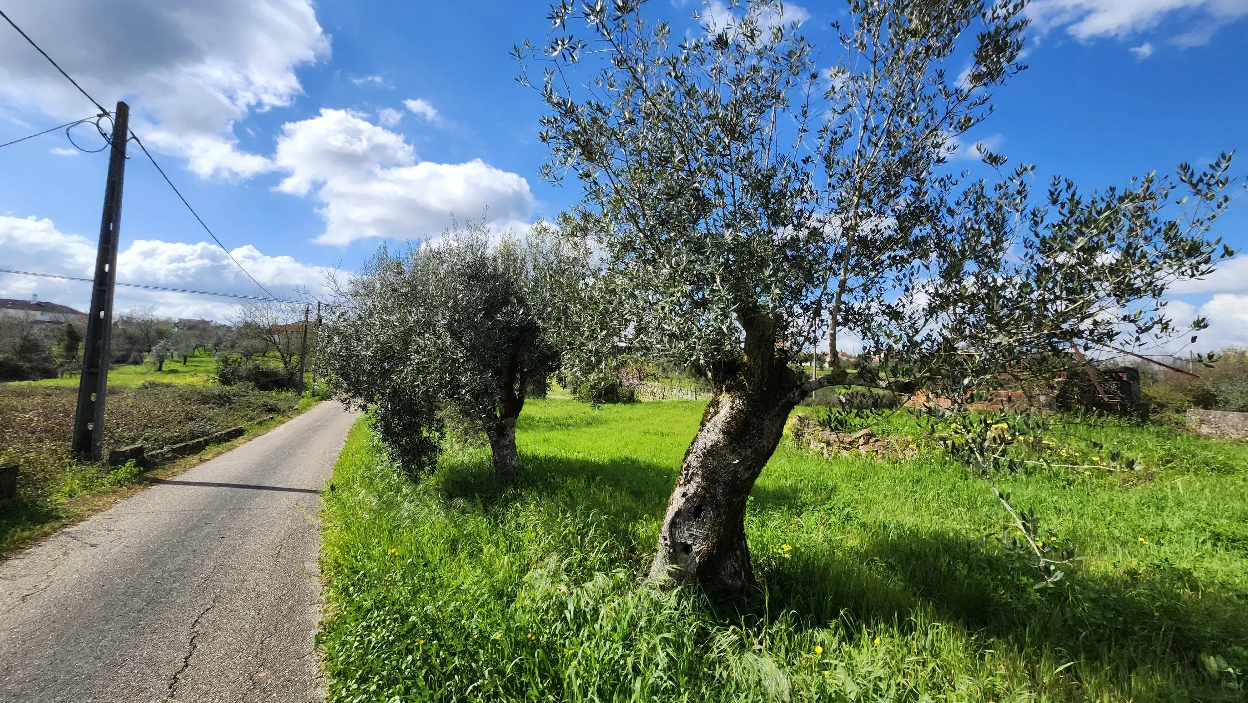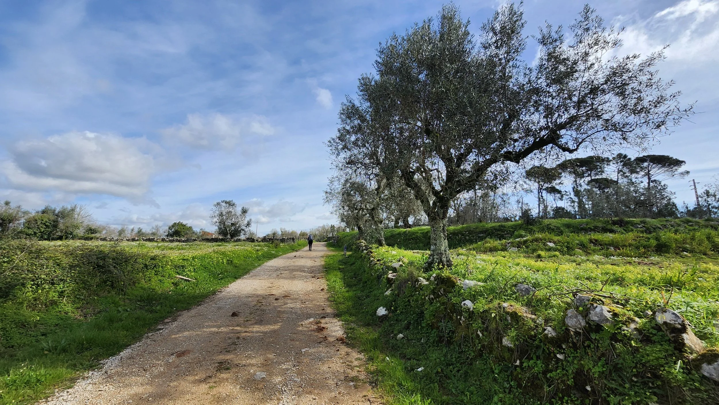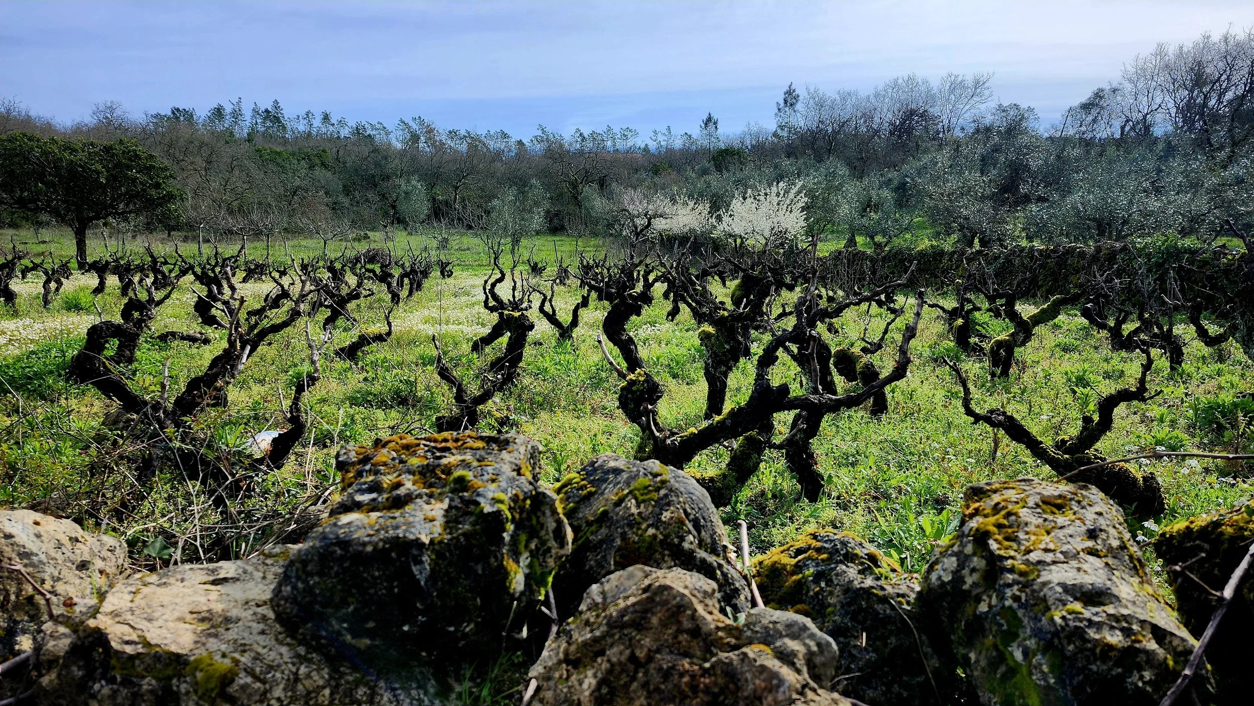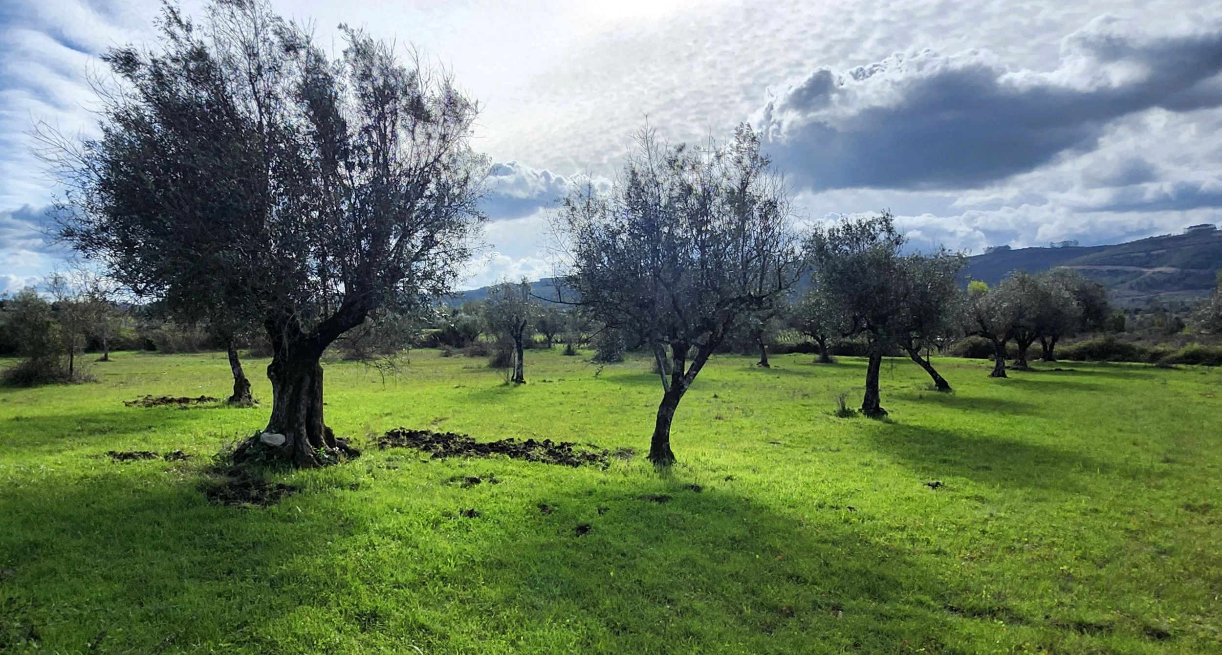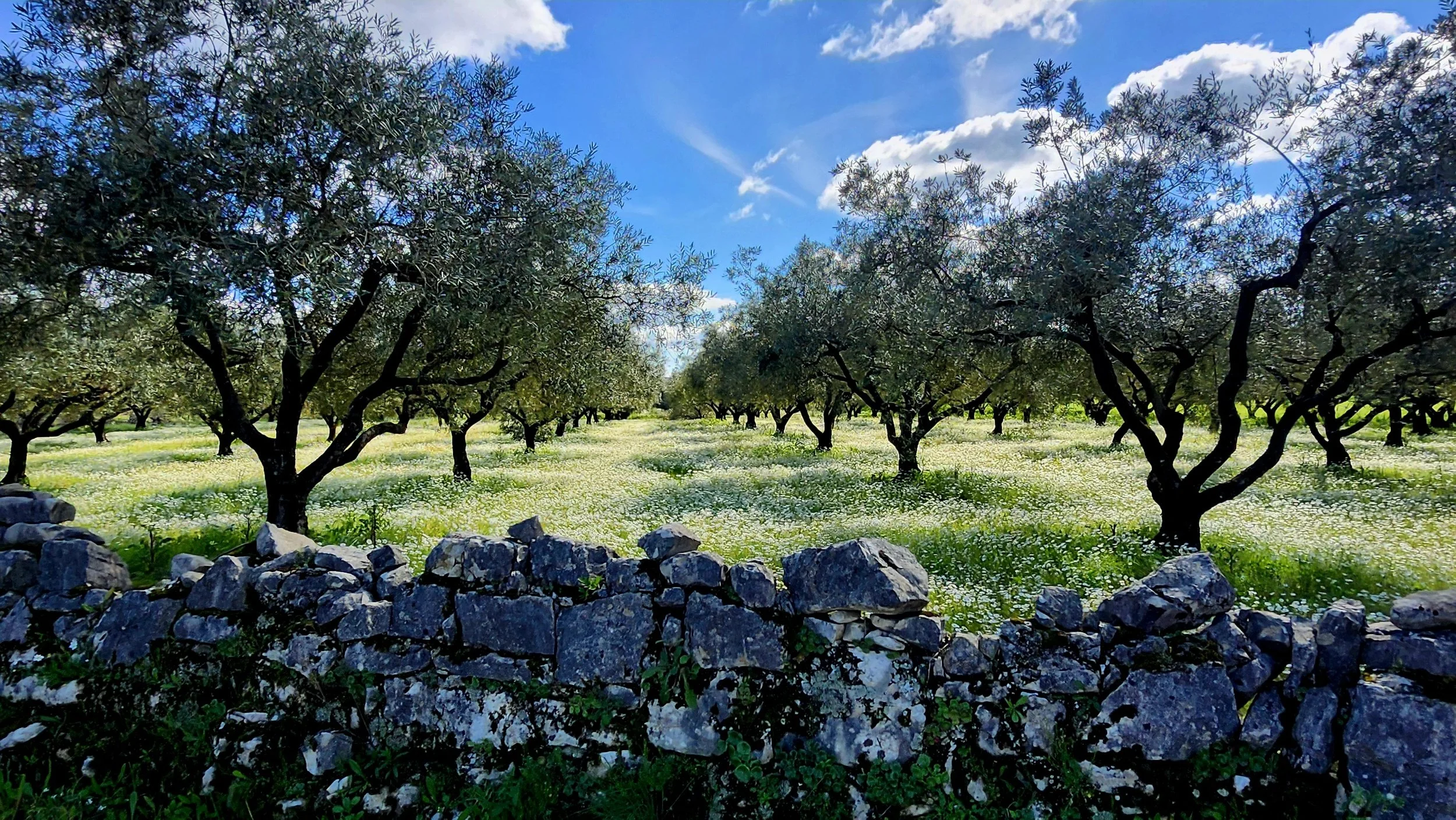 Old rock walls and olive trees.