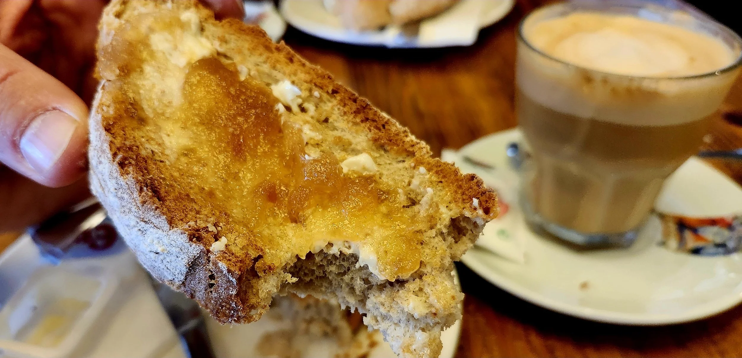 Toast! Our favorite breakfast is toast, butter, jam and a cafe con leche. Spain is excellent at toast. Portugal, not so much. However, Portugal has a better coffee to milk ratio in their cafe con leche. I prefer more coffee to milk.