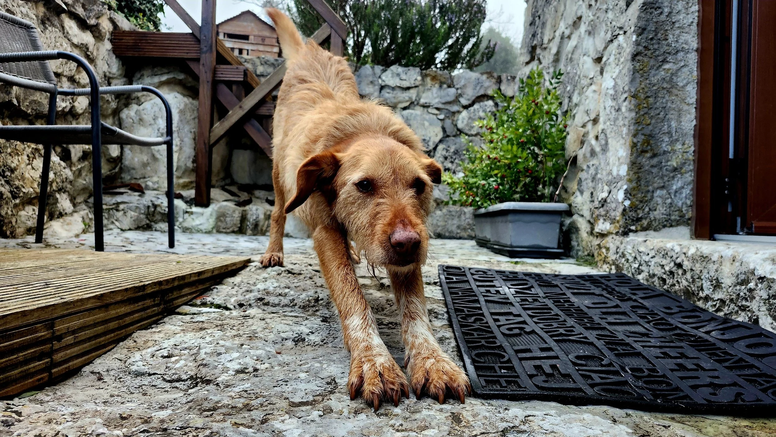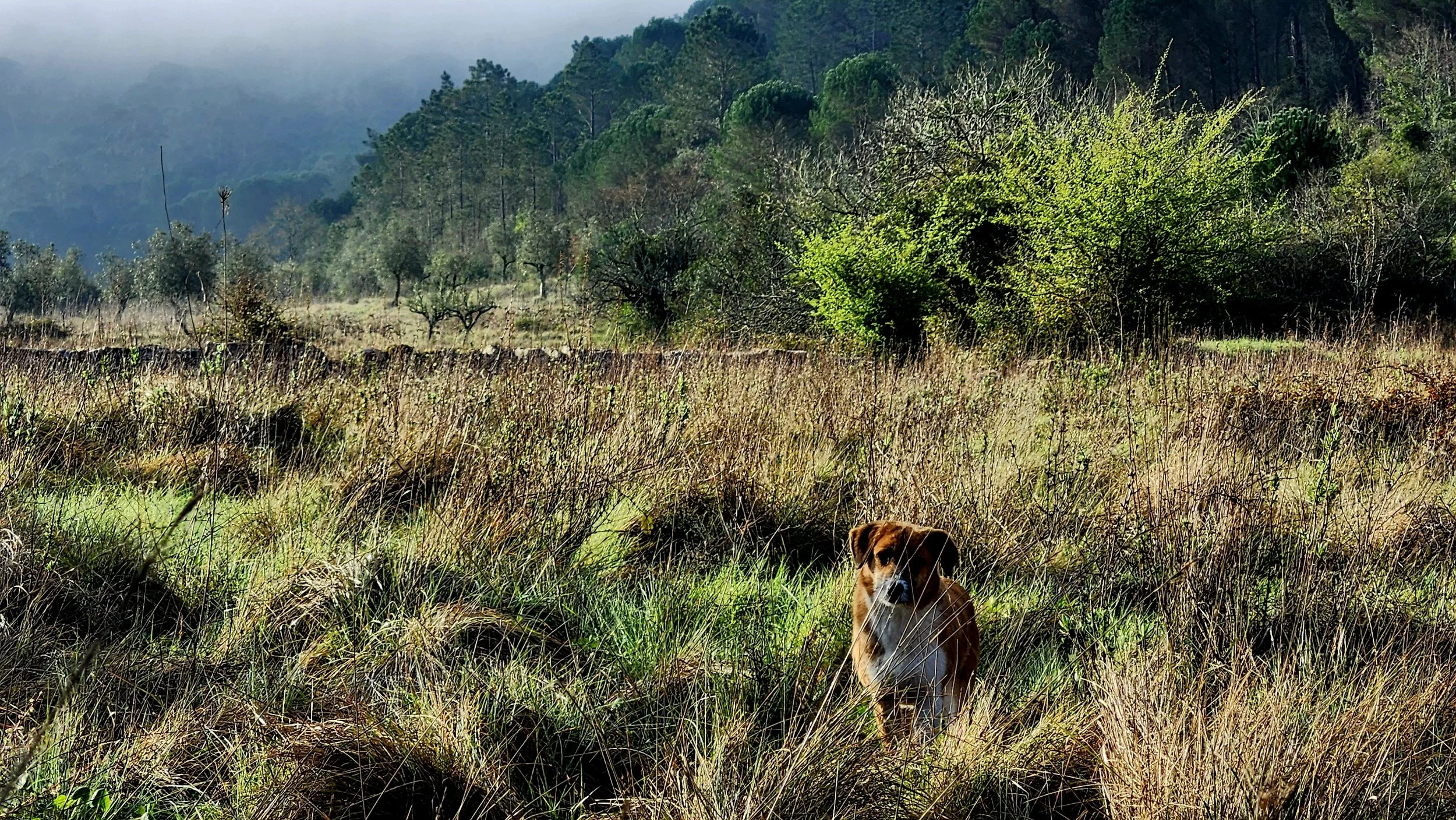 “Chocolate” - he was ready and willing to hike to Santago with us. He snuck up on us and gave us full body tail wags. He walked with us for a quarter mile before we had to tell him to go home. He got a treat.